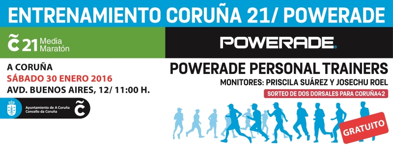 Este sábado haberá un adestramento de apoio para a media maratón C21. Será ás 11h no Paseo Marítimo, xunto ao Praia Club. Trátase dunha actividade patrocinada por Powerade, de caracter gratuíto, en colaboración co Concello da Coruña.