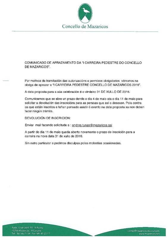 Por motivos alleos á Federación Galega de Atletismo infórmase do cambio de data da Carreira Pedestre de Mazaricos. Quedando establecida a data de celebración da proba para o 31 de xullo do 2016.