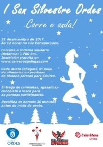 Dende o Departamento de Deportes do Concello de Ordes lembran a todas as persoas interesadas que o próximo xoves, 28 de decembro, conclúe o prazo para poder inscribirse na I San Silvestre Ordes. A carreira terá lugar o vindeiro domingo, 31 de decembro, ás 12 horas. Non se trata dunha proba exclusivamente competitiva, xa que o percorrido previsto de 3,700 quilómetros tamén se poderá realizar a modo de andaina. Deste xeito quérese ofrecer a posibilidade de participar a todo tipo de persoas. O principal obxectivo é despedir o ano conxuntamente e de forma divertida, á par que se leva a cabo unha actividade física. O lugar de saída será na rúa Entreparques, onde media hora antes do comezo da proba se repartirán os dorsais.