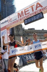 Pedro Nimo y David Santos cruzaron al mismo tiempo la meta de la praza do Obradoiro. Ambos atletas se cogieron de la mano para concluir la MediaSan do Camiño tras veintiún kilómetros con un tiempo de 1 hora, 13 minutos y 25 segundos. En la categoría femenina, la vencedora fue Raquel Suárez, que recientemente triunfó en la media maratón de A Coruña. Invirtió un tiempo de 1.31.13.