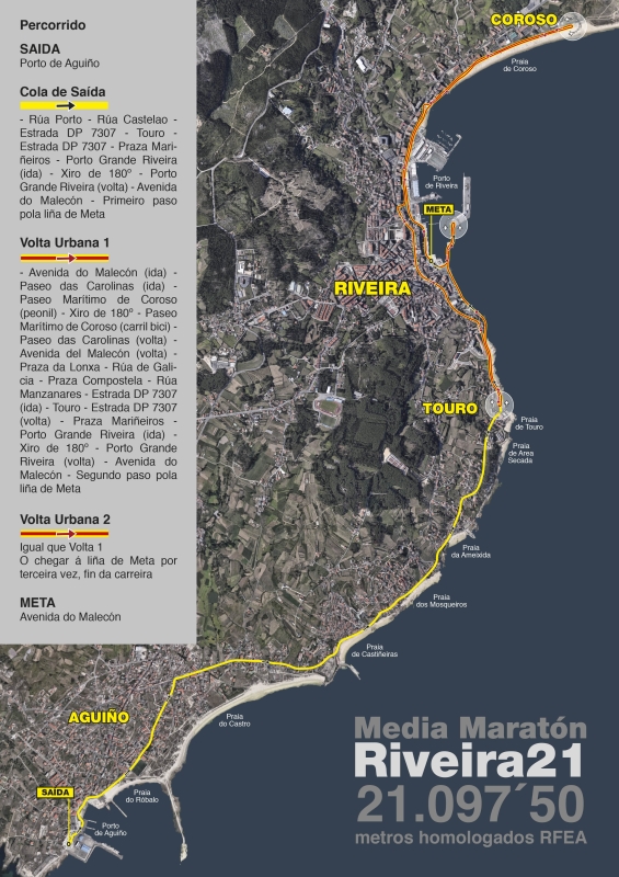Rúa Porto (Aguiño) - Rúa Castelao (Aguiño) – Rúa Listres (Aguiño) - Estrada DP 7307 (por Os Areeiros, Castiñeiras e A Ameixida) – Touro - Estrada DP 7307 (entrada en Riveira) - Porto Grande de Riveira (ida) - Xiro de 180º - Porto Grande de Riveira (volta) - Avenida do Malecón